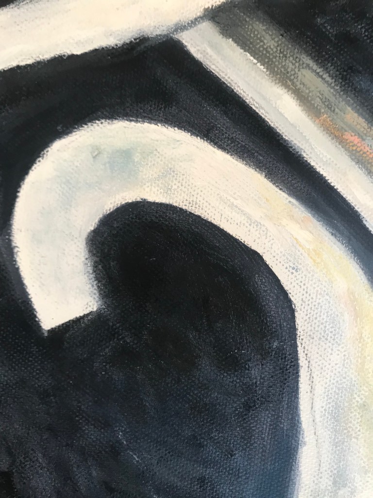 To the painting, a little obviously titled, “At the hospital”. Hospitals are not the most aesthetically pleasing places, but hospitals are aesthetically interesting. Ultimately utilitarian spaces – a higglty-pigoty , hotch-potch amalgam of buildings, walkways, signage and carparks which have evolved overtime and generations to meet community needs (when alignment with funding allows). I’ve noticed most hospitals are like this, bustling with activity and bursting at the seams. St Vinnies in Sydney is like that and my dad says the hospital in London where he trained as a lab technician in the 60’s was the same.