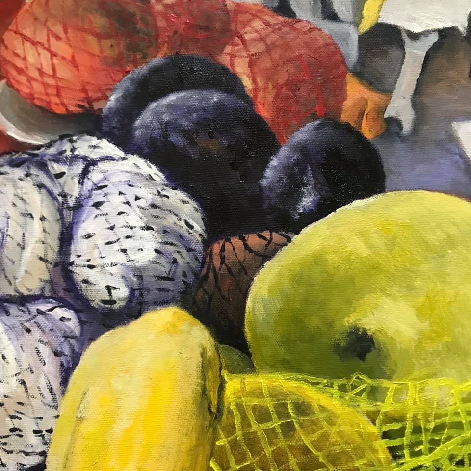 The painting is a snapshot of our kitchen bench. Evidence of the ephemeral, the daily, constant movement of stuff: food, tools, kid’s crud, magazines and paperwork. It’s where work and home intersects before being moved on when it all gets overwhelming. My tolerance for both order and disorder is quite remarkable. A tide of stuff in constant flux that flows and edies before coming to rest in the corners, like the dog hair.