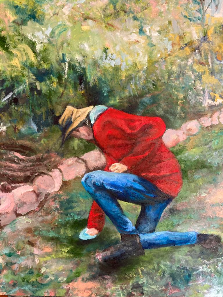We have many identifies over a lifetime and ‘The Chief Economist’ is just one of the many roles played by my partner Kim. As you can imagine, this position requires a sense of gravitas and seriousness which is not reflected in the painting. In this painting Kim is still doing an important job, and is not purposely dressed as a Crimson Rosella, but the notion of this, that he could also don this garb, while still being “The Chief Economist” underneath, appealed to me. Benefits of working from home. It is also a well-known fact that neither Kim, or I, like to take ourselves too seriously and this painting is a reminder of that.