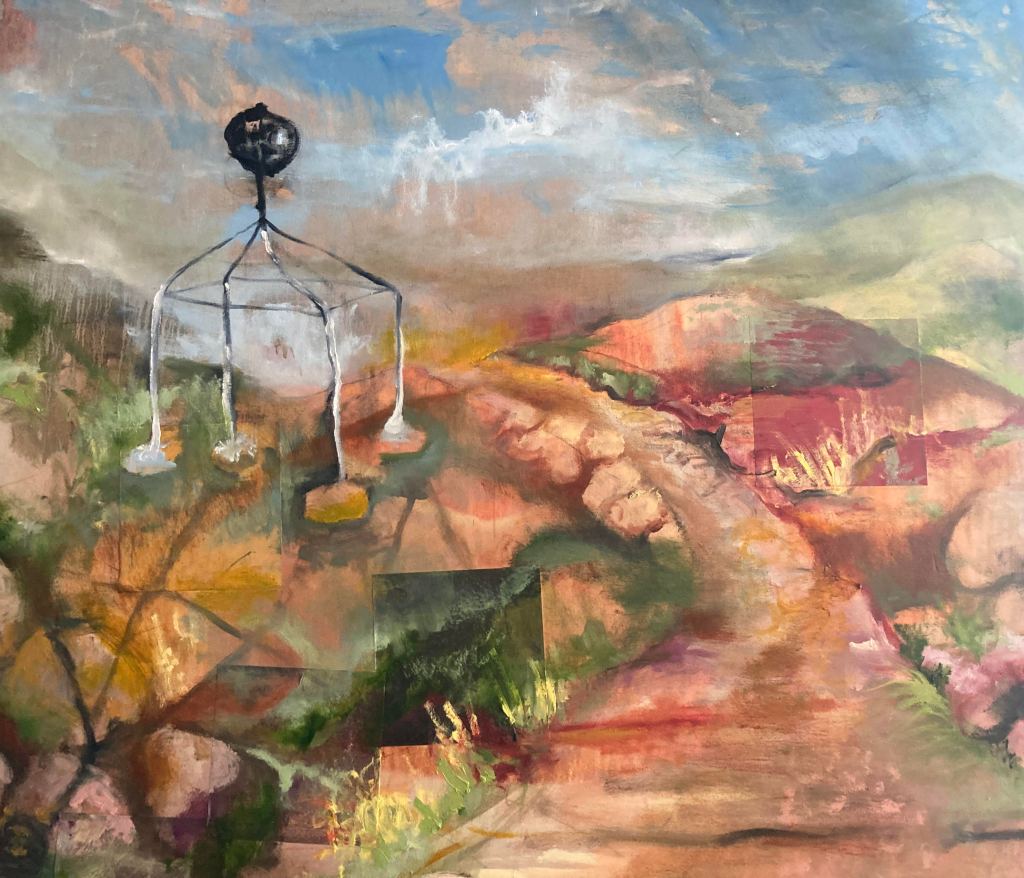 I’ve always thought that Trig Points look rather incongruous and at odds with the surroundings, like strange alien invaders. That’s how the Trig Point looks in this painting and perhaps what it is symbolic of. Trig points to me suggest both conquest over the land or over a subliminal journey, when the pinnacle is reached, and an obstacle is summited. This is both literal, metaphoric, and problematic for the environment (or the mind) which is being thus sublimated. While the Trig point in the painting is based on a real Trig Point, the landscape is more ambiguous. Perhaps a landscape of the mind, it is a landscape which is layered with meaning which may not be within our understanding (and therefore cannot be conquered, even if it is occupied). The landscape depicted in this painting is scared by many things: fire, people, and the passage of time.