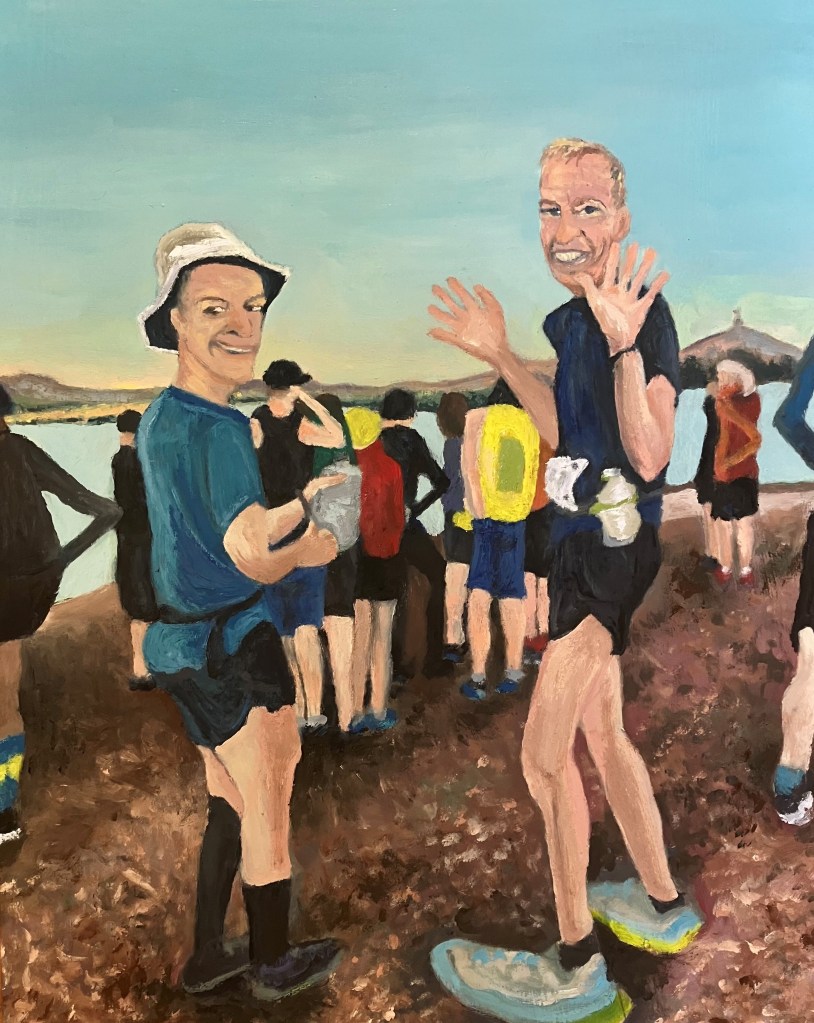This painting depicts the early morning start of the annual Sri Chinmoy 100km Centenary Trail Run. This is an event people do in teams, in pairs or by themselves, around Canberra. It takes participants up and over many of the accessible Trig points and this year, I was supporting my partner who was doing the event in a team of two.