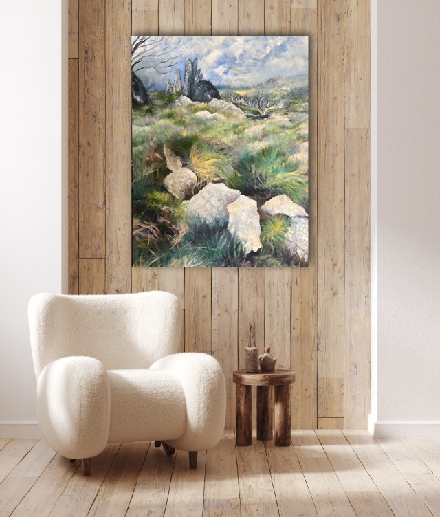 This image is from one from my Trig point series. It’s a great walk to Mount Gingera where there is a unique ecosystem. The landscape depicted in this painting initially looks quite beautiful in a gothic, high country, mountainous kind of way. However, clearly visible in this area is the significant devastation caused by the 2020 bushfires. The landscape, while in recovery, is scarred by this event and thus the ghostly, skeletal remains of the forest of burnt trees sit in the background as a reminder of that recent trauma as well as a signifier of our ever-present collective impact on the environment.