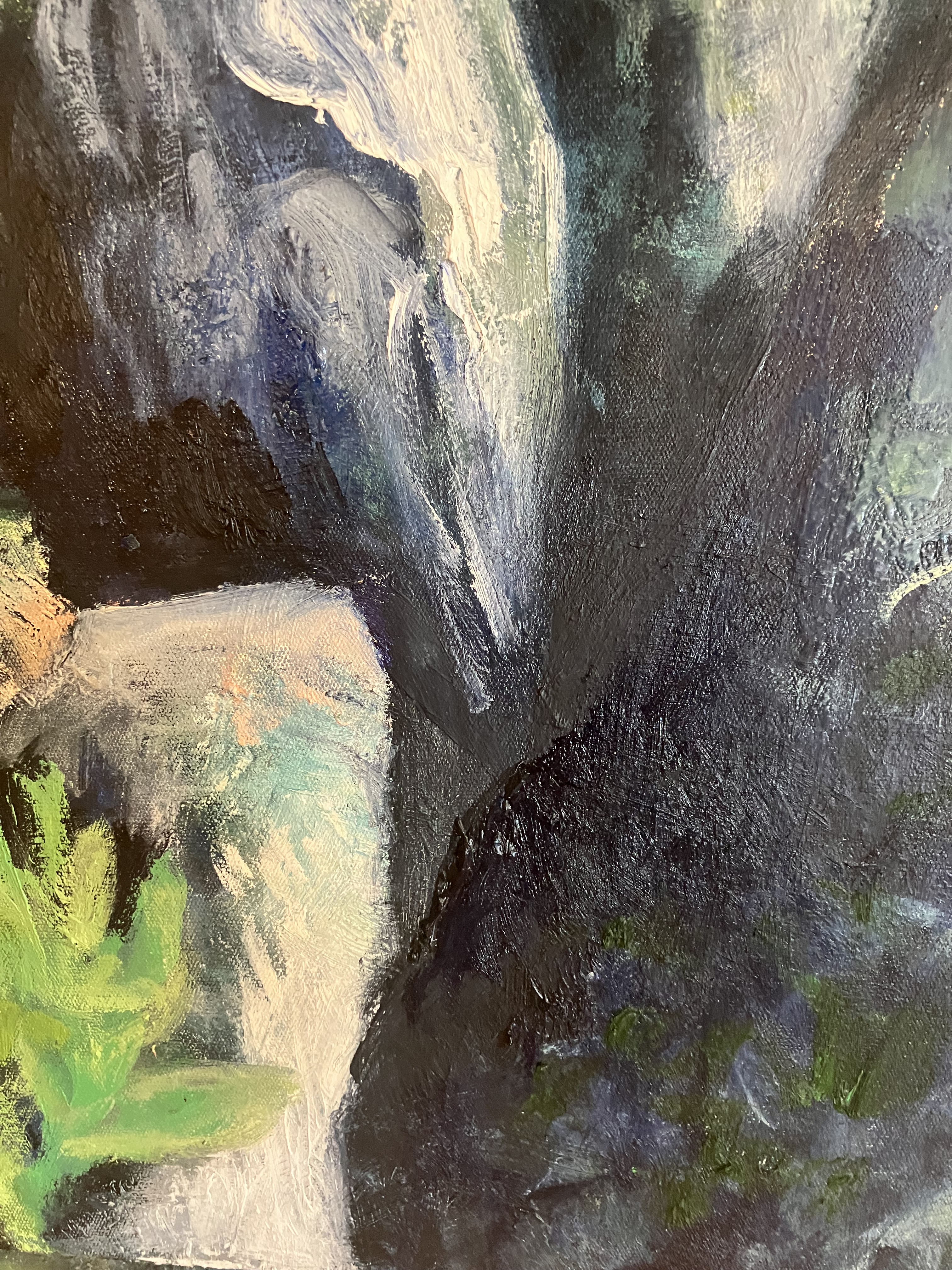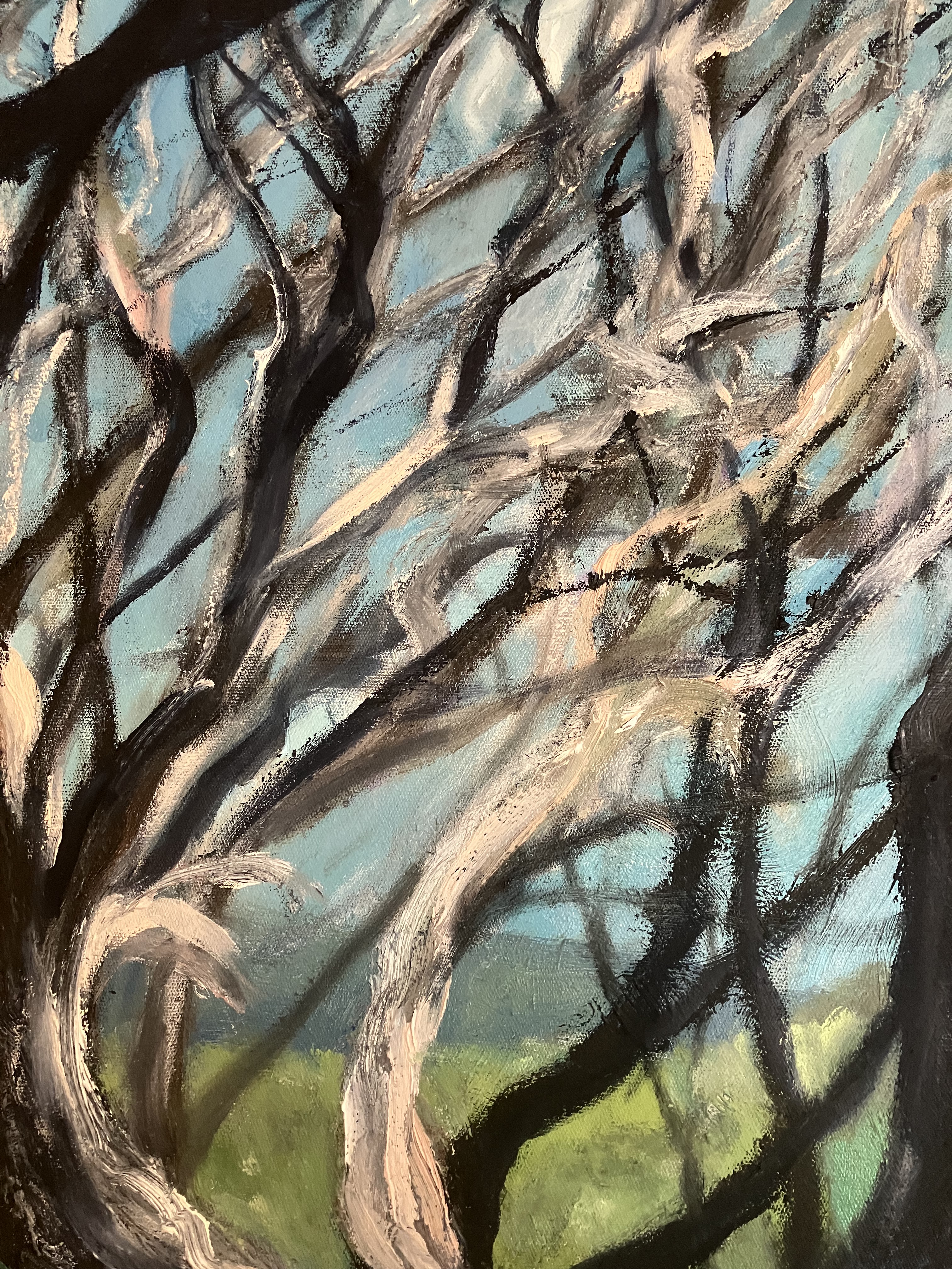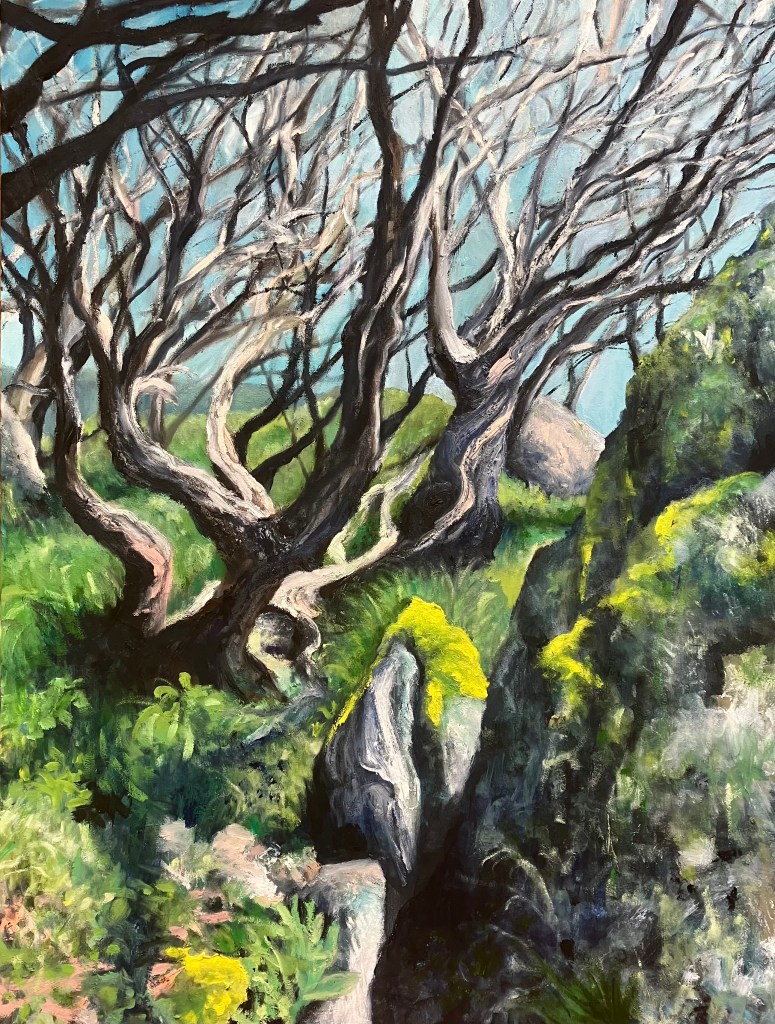 It’s a great walk to Mount Gingera where there is a unique ecosystem. The landscape depicted in this painting initially looks quite beautiful: the colours are glorious and there’s a vibrancy in the viridescent tones of regrowth; the granite rocks contrast so nicely with the tree branches in terms of form and texture.