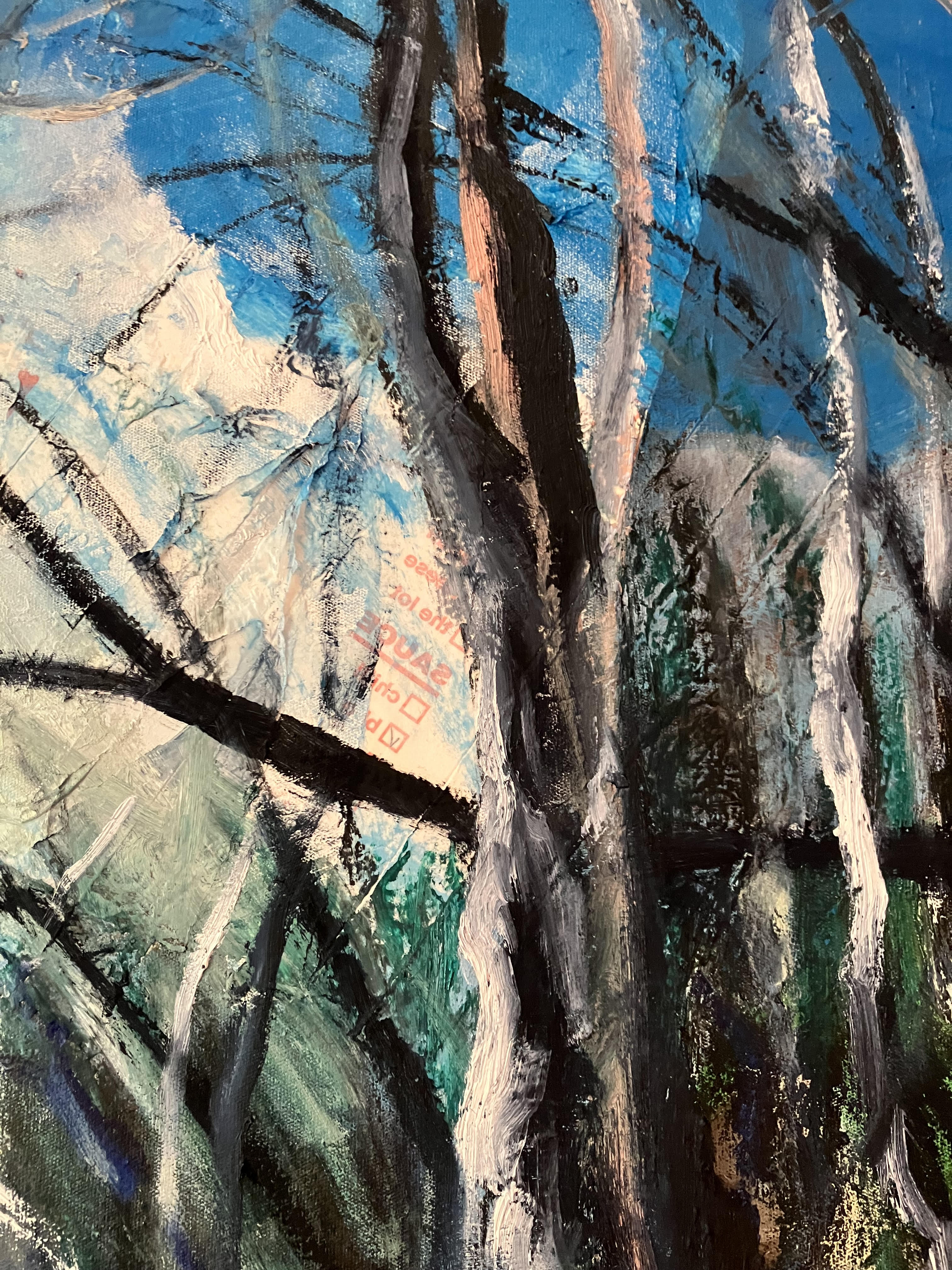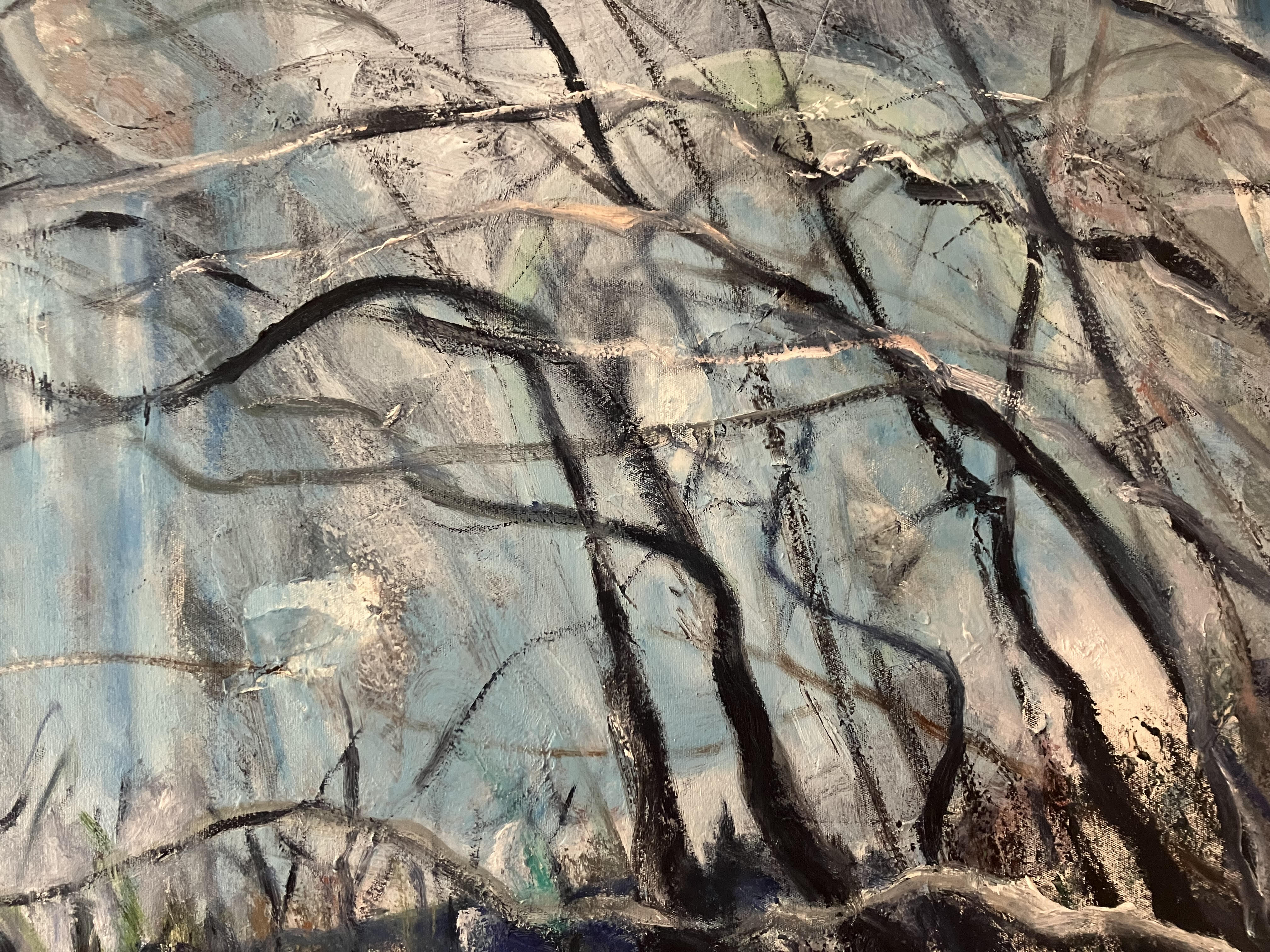 This image is from one from my Trig point series. It’s a great walk to Mount Gingera where there is a unique ecosystem. The landscape depicted in this painting initially looks quite beautiful in a windswept, high country, mountainous kind of way. However, clearly visible in this area is the significant devastation caused by the 2020 bushfires. The landscape, while in recovery, is scarred by this event and thus there is fields of burnt trees.