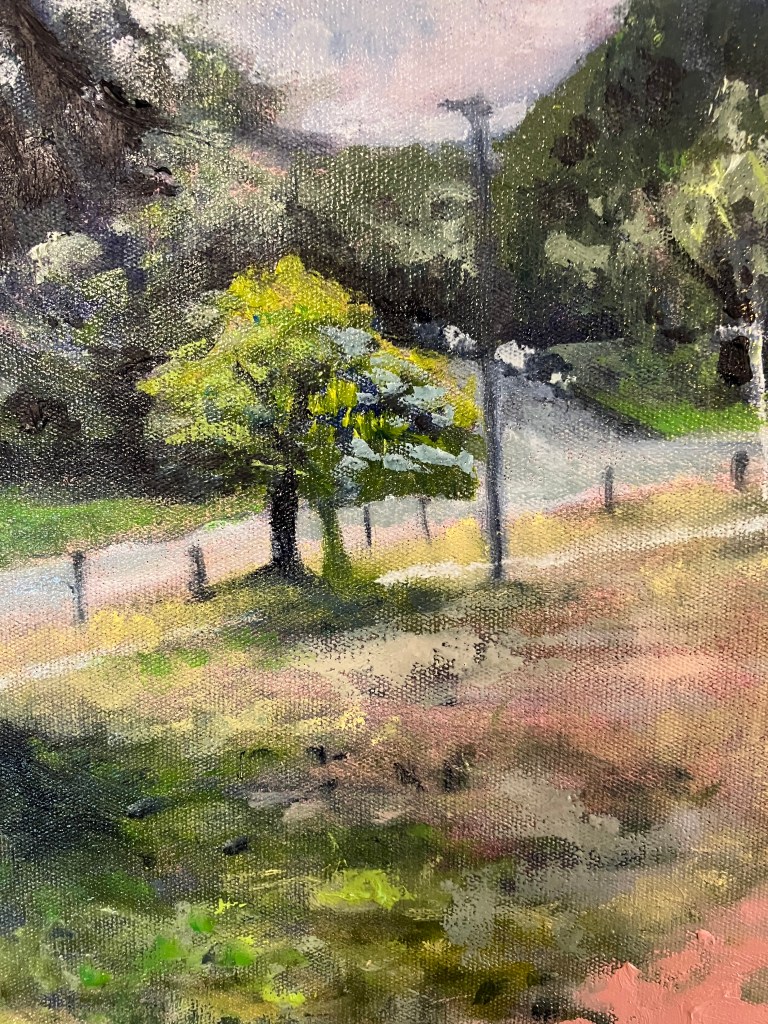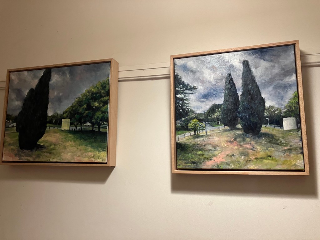 I’m doing a series of small paintings which are primarily along the lines of green urban space, street trees I (and others) know and love, and other little snippets of old, or un-noticed Canberra. Or something like that. These are the conifers out the front of the Ainslie shops.