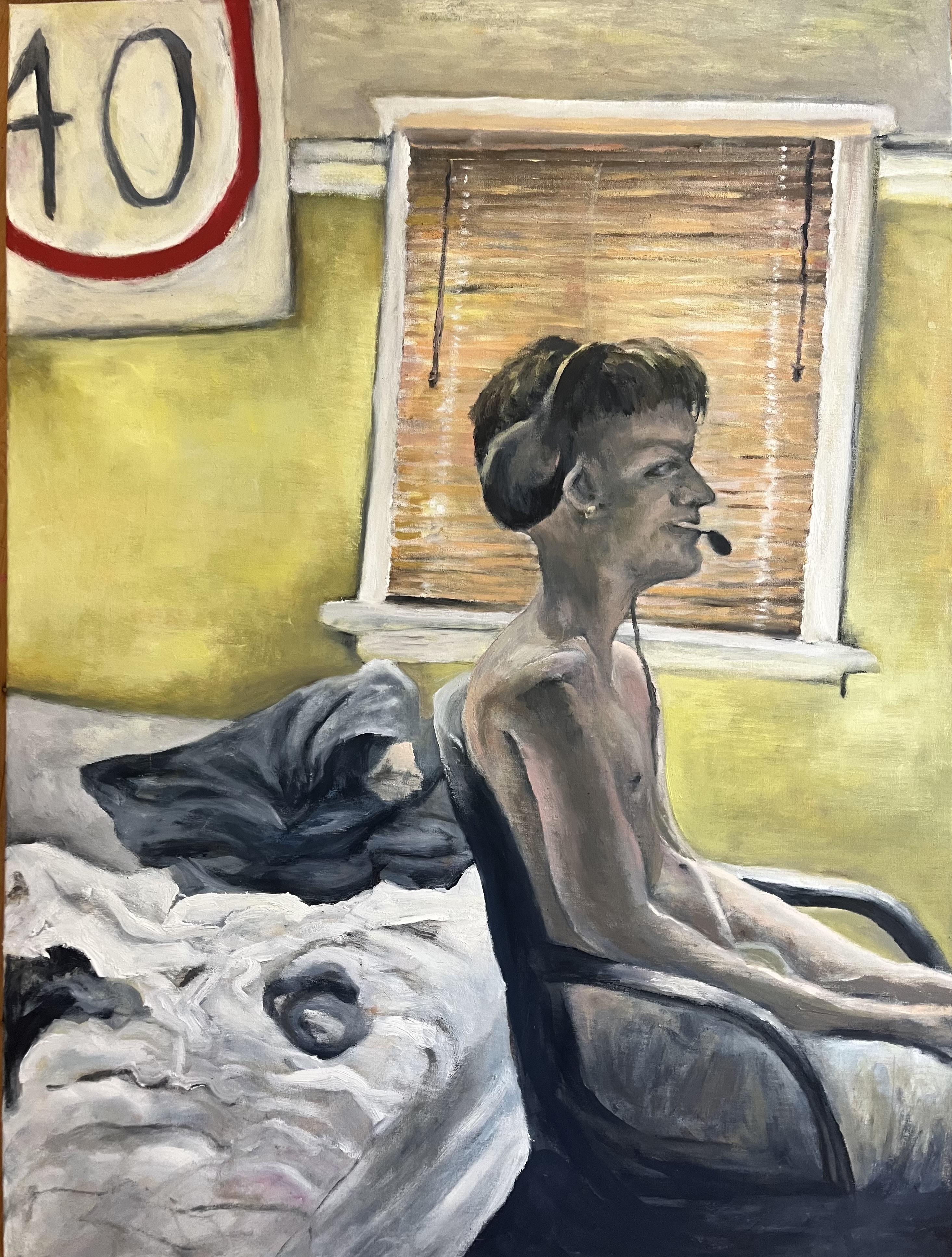 Zeb is normally a bit of an action man: going to the gym; playing basketball; soccer and golf (tempted to say something else here about golf but I will hold my tongue). So this more passive viewpoint reflects only one aspect of who he is and what I see. Also, while he looks passive, the painting doesn’t come with inbuilt sound effects of him shouting down the microphone at his virtual companions, including his brother, in the room next door.