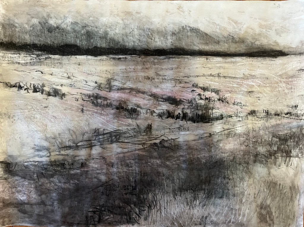 Mixed media (charchol, ink, gesso, and oil paint glaze) on lithograth paper.